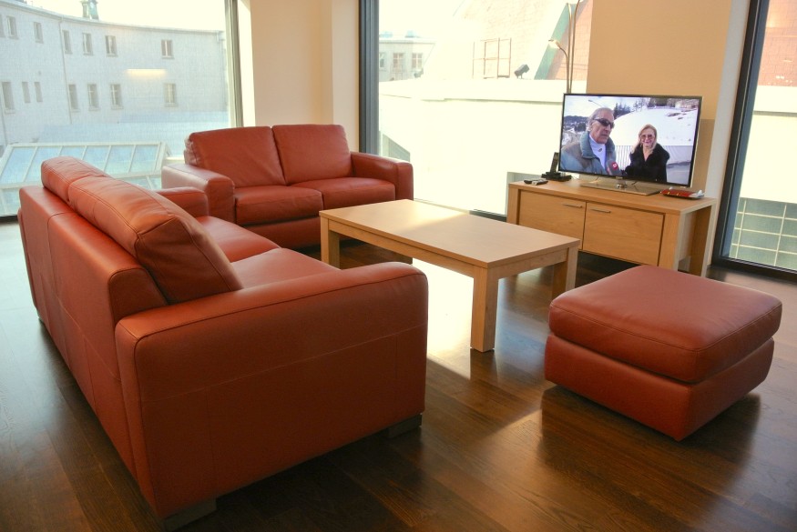 - lounge area: large off-white leather sofa and footrest by de Sede, designer wooden coffee